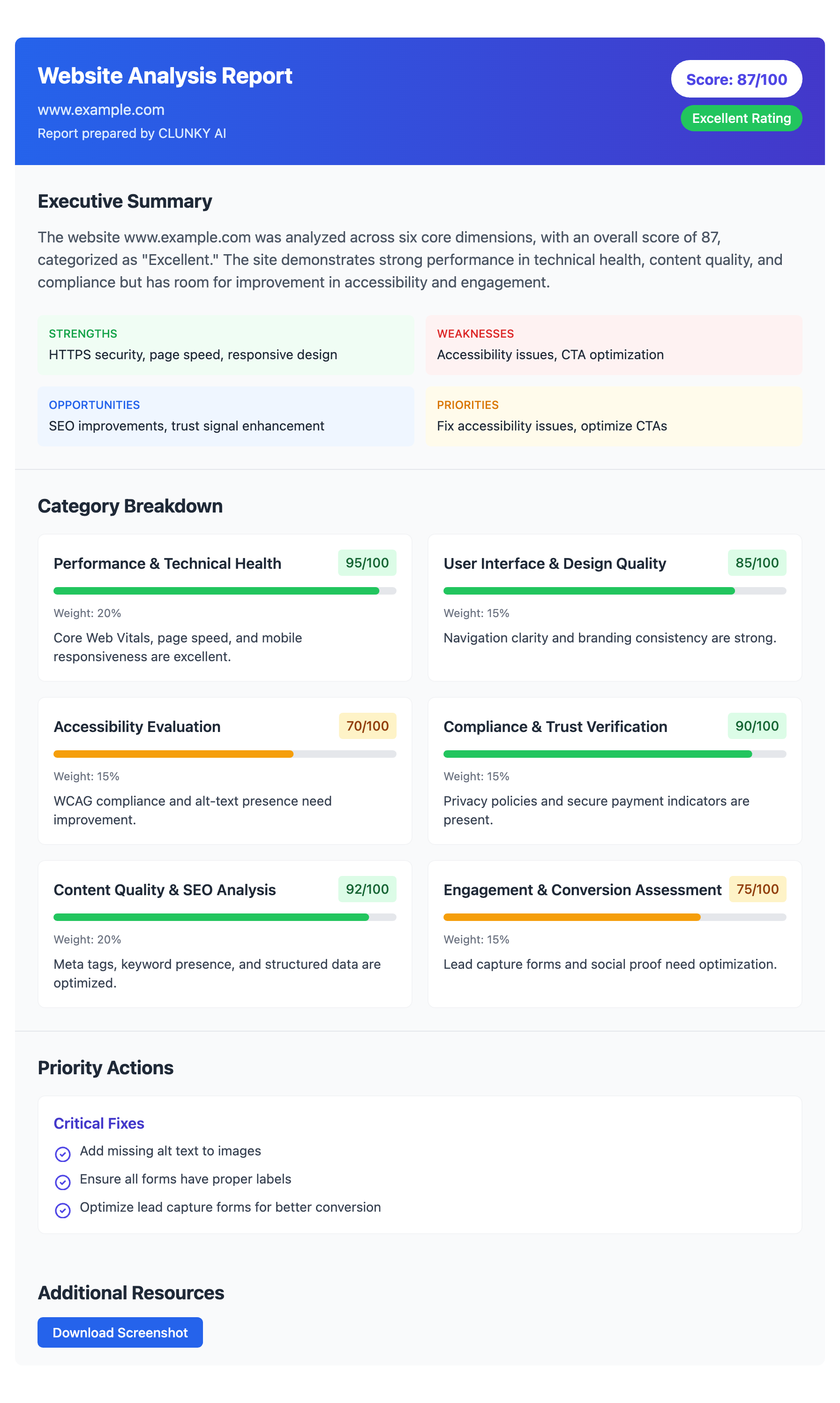 dCLUNK™ scans your website for UX, Performance, Accessibility & Compliance bottlenecks — then shows you fixes that matter.